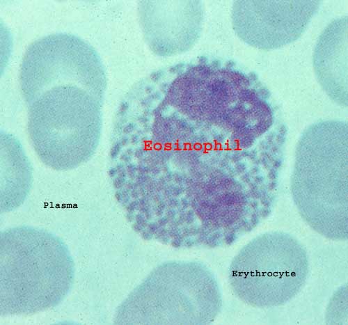 An eosinophil -- stained lighter than the similar basophil. Note the eosinophil (and basophil) are significantly larger than red blood cells.