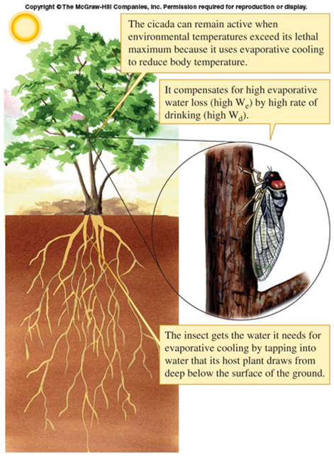 There is one Cicada species, a specialist on the desert plant Mesquite, that is actually active and calling during the very hot daytime temperatures. If it's body temperature reached the actual air temperature on some of the hottest days, it would be fatal. However, it has small pores in it's exoskeleton through which it evaporatively cools itself. How can it afford to lose water during the day? Because it has a beak that can tap into the water in the xylem of the Mesquite. Why be active during the day at all? Because if you CAN do it, you can avoid most of the predators, which, as indicated previously, are active only at night.