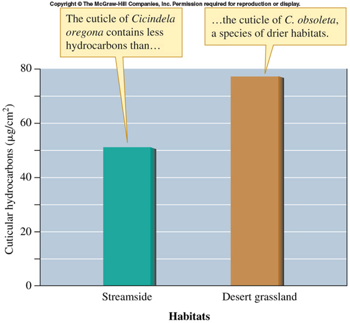 Special adaptations for preventing water loss. Tiger beetles in drier habitats have higher hydrocarbon content in their exoskeletons. Hydrocarbons are hydrophobic, and prevent water from leaving the body. So, more hydrocarbons in a dry environment, less water loss.
