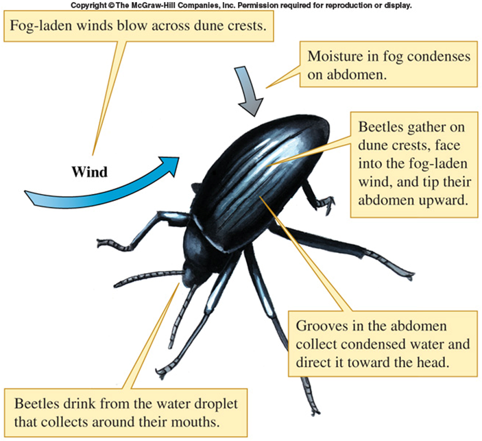 Special adaptations for water gain in the Namib Desert Darkling Beetle. This beetle lives in an environment with very little rainfall (a desert). But early morning fogs (air with LOTS of moisture) blow across the dunes. The beetles stand with abdomens pointed toward the sky. Water condenses on the surface (elytra) of the beetle, and the water follows grooves in the surface downward toward the mouth, where the beetle then drinks the water.