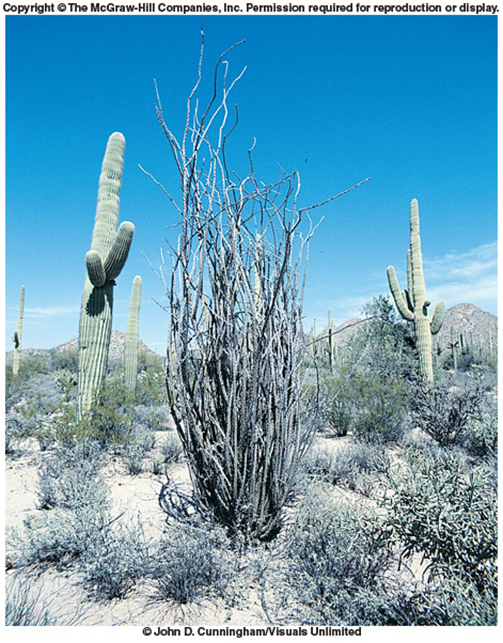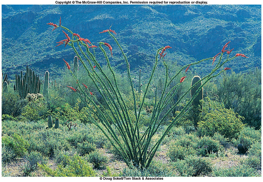 Ocotillo, a desert plant, leafs out and blooms during the brief spring and fall monsoon rains; during the dry parts of the year, the plant drops all leaves and looks completely dead (picture below).