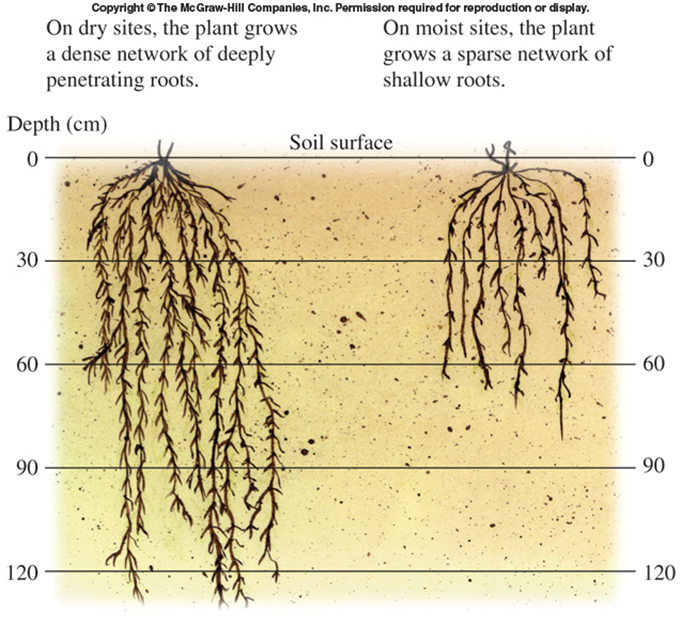 Sagebrush grows a deeper, more branching set of roots on dry sites than wet sites.