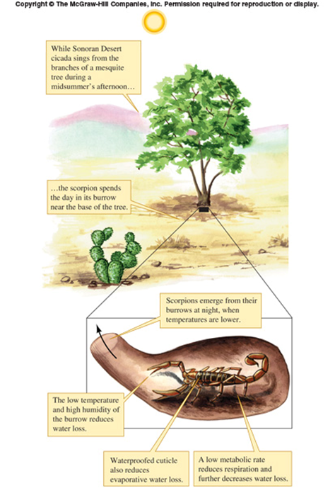 Scorpions hide in burrows during the daytime, in order to conserve water during the hot daytime temperatures. Like many desert animals, they restrict their activity to nighttime.