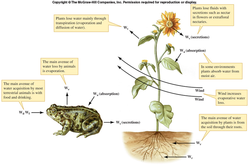 As with heat, water loss must typically be balanced by water gains. For animals, the main water loss is by evaporation, and through release of wastes (urine and feces), although water loss through waste can be remarkably minimized in some. The main gains are through food and drinking, and at least some water is MADE through metabolic processes (remember that one of the products of cellular respiration is water). For a plant, the main water loss is, as discussed above, through transpiration (evaporation out of the stomates), and to a much lesser extent evaporation from elsewhere (nectar, etc.). The main gain, also as discussed above, is through the roots.
