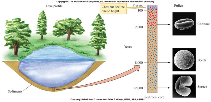 From the sediment in a lake in the southern Appalachians, pollen from 12,000 years ago shows mostly Spruce, by 8000 years ago we see Beech pollen and by 2000 years ago we see Chestnut pollen joining the other two, with Spruce and Beech becoming less common. This shows the progression of the trees northward after the last ice age.