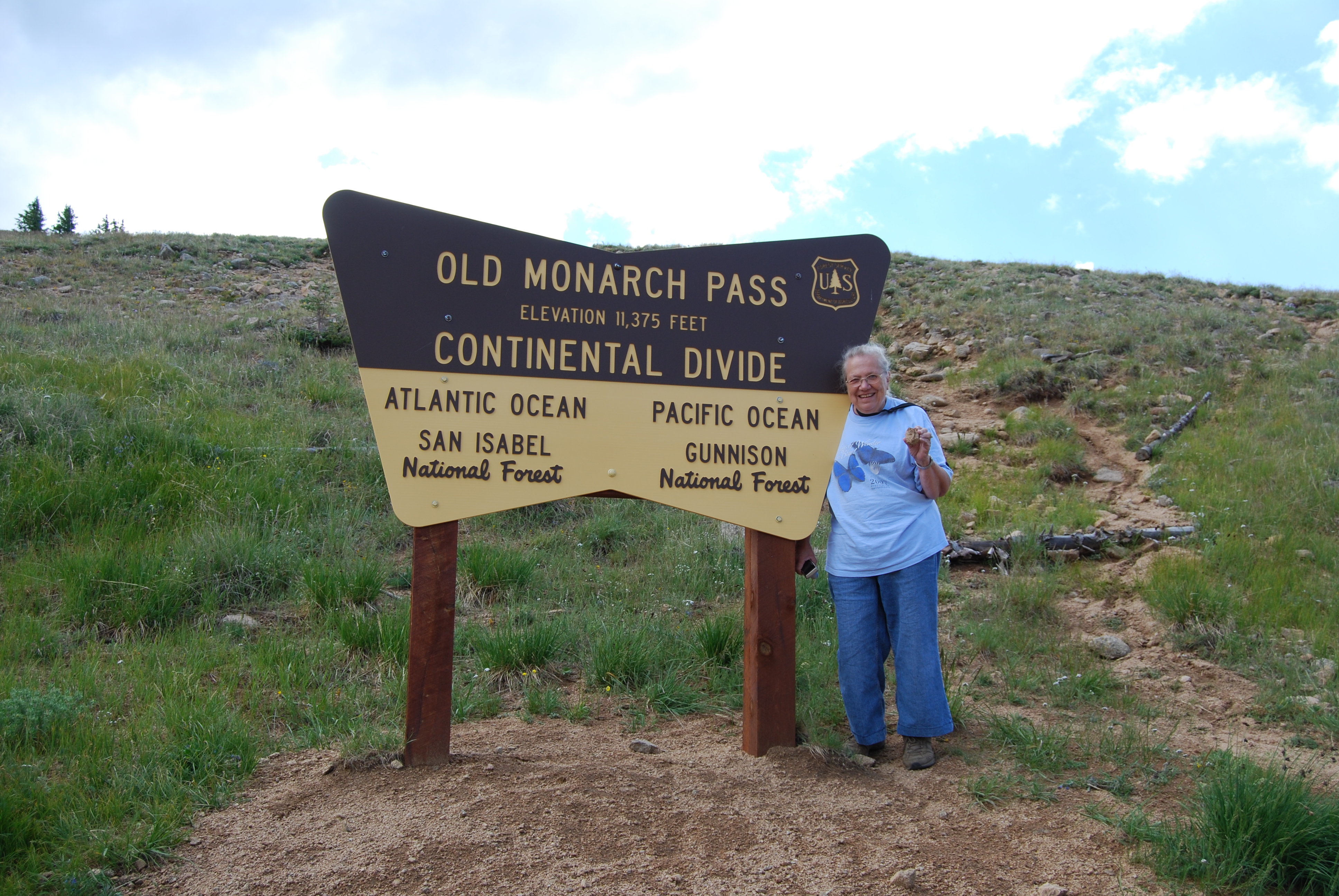 My mom standing in front of the Old Monarch Pass sign, with Alpine tundra