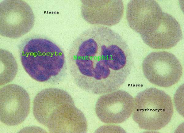 A lymphocyte -- note nucleus filling nearly entire cell that is not much larger than a red blood cell.A neutrophil -- note larger cell with many-lobed nucleus, typically differently lobed in each neutrophil.