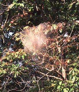 Two forms; specimens can range from pure white to more densely spotted than the specimen on the right; this species is commonly called the Fall Webworm, as the caterpillars typically build large webs (tents; see below) inside which many larvae will feed; © James Adams, 2001.