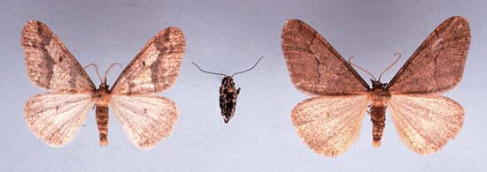 Two male forms, female (wingless) in middle, © James Adams, 2001.