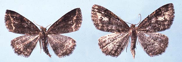 These specimens are from relatively high elevation in the Smokies, whereas the top specimen is from lower elevation in Georgia. I am not totally convinced that these represent the same species. Note again the variability in white markings on the forewings (compare with H. lactispargaria). This species (and H. fritillaria) are much blacker than H. lactispargaria. © James Adams, 2002.