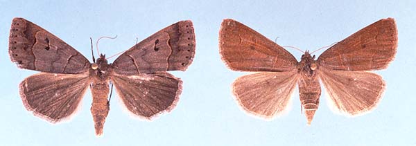 Two of several forms, that may differ quite a bit in background color; the closely related P. ingenua has been recognized as distinct, and, as that species is also variable, is very difficult to distinguish from P. atomaris; two features that may be helpful are that, where the two occur together, P. ingenua is almost always the larger species, and the submedian line typically has a sharp bend in it in atomaris (though not always; see above), whereas this same line is more gently curved in ingenua (again, not always). And, perhaps the best feature to distinguish the two is that the male antennae have longer setae (more "feathery"). © James Adams, 2001.